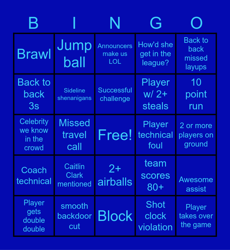 This bingo card has a free space and 24 words: Caitlin Clark mentioned, smooth backdoor cut, Successful challenge, Player gets double double, Back to back missed layups, Brawl, Back to back 3s, Jump ball, Player technical foul, 2+ airballs, Player w/ 2+ steals, Celebrity we know in the crowd, team scores 80+, Awesome assist, Sideline shenanigans, Shot clock violation, 2 or more players on ground, Announcers make us LOL, 10 point run, Missed travel call, Player takes over the game, Coach technical, How'd she get in the league? and Block.
