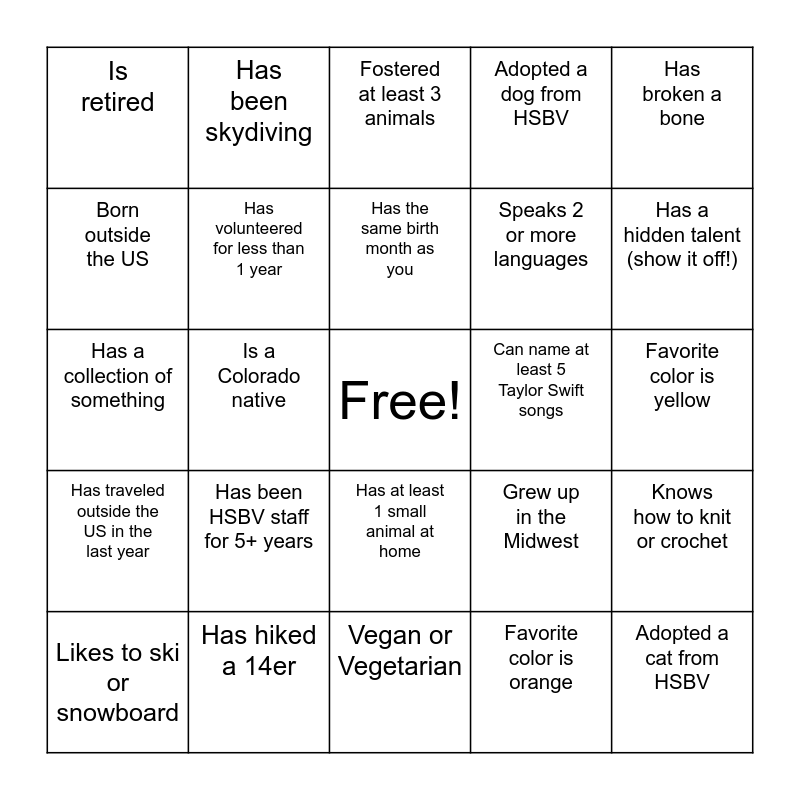 This bingo card has a free space and 39 words: Owns 10+ houseplants, Has been an adoption specialist, Has volunteered for 5+ years, Has volunteered for less than 1 year, Likes to ski or snowboard, Has at least 1 small animal at home, Has the same birth month as you, Can play a musical instrument, Has broken a bone, Has traveled outside the US in the last year, Is a Colorado native, Adopted a dog from HSBV, Adopted a cat from HSBV, Favorite color is yellow, Can name at least 5 Taylor Swift songs, Has been HSBV staff for 5+ years, Has been HSBV staff for less than 1 year, Is retired, Grew up on the East Coast, Grew up in the Midwest, Born outside the US, Vegan or Vegetarian, Speaks 2 or more languages, Has a hidden talent (show it off!), Is left handed, Reads 10+ books a year, Has run in a marathon, Likes to cook, Can bake bread, Has been skydiving, Likes classical music, Has 0 unread text messages, Fostered at least 3 animals, Has hiked a 14er, Favorite color is orange, Is an avid bird watcher, Knows how to knit or crochet, Has a collection of something and Can tell a good joke (tell us!).