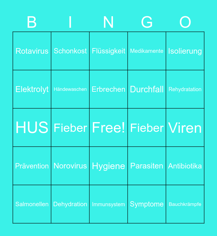 This bingo card has a free space and 24 words: Norovirus, Dehydration, Erbrechen, Salmonellen, Isolierung, Rotavirus, Elektrolyt, Schonkost, Fieber, Hygiene, Durchfall, HUS, Parasiten, Antibiotika, Händewaschen, Symptome, Viren, Flüssigkeit, Rehydratation, Fieber, Bauchkrämpfe, Prävention, Medikamente and Immunsystem.