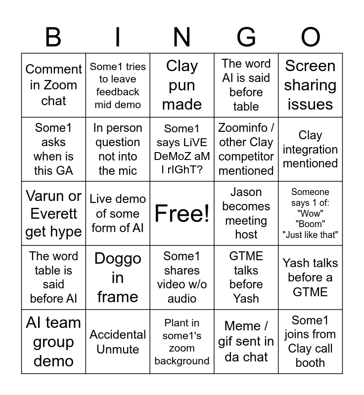 This bingo card has a free space and 24 words: Doggo in frame, Accidental Unmute, Some1 says LiVE DeMoZ aM I rIGhT?, AI team group demo, Screen sharing issues, Comment in Zoom chat, Some1 asks when is this GA, Some1 tries to leave feedback mid demo, Jason becomes meeting host, Some1 shares video w/o audio, Zoominfo / other Clay competitor mentioned, Varun or Everett get hype, GTME talks before Yash, Yash talks before a GTME, In person question not into the mic, Meme / gif sent in da chat, Someone says 1 of: "Wow" "Boom" "Just like that", Clay pun made, Clay integration mentioned, Live demo of some form of AI, Some1 joins from Clay call booth, The word table is said before AI, The word AI is said before table and Plant in some1's zoom background.