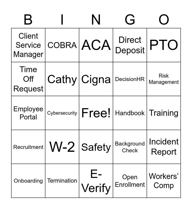 This bingo card has a free space and 43 words: HR, Workers’ Comp, Benefits, Onboarding, Compliance, Open Enrollment, ACA, Time Clock, PTO, Termination, Direct Deposit, Handbook, Safety, W-2, I-9, E-Verify, FMLA, Employee Portal, Garnishment, Risk Management, COBRA, 401(k), Labor Law Posters, Client Service Manager, Claims, Training, Job Posting, FSA/HSA, Background Check, Recruitment, Pay Stub, Incident Report, Worksite, Cybersecurity, Term Life, Guardian, Florida Blue, Cigna, Time Off Request, DecisionHR, Peter, Cathy and Chris.