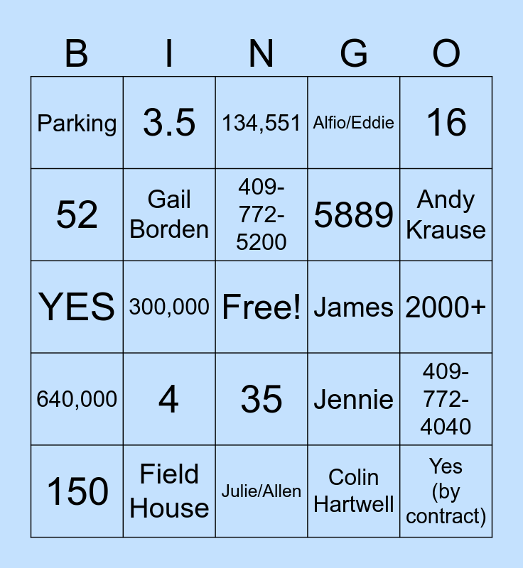 This bingo card has a free space and 24 words: 4, Field House, 409-772-5200, 150, 16, Parking, 52, 3.5, James, 35, 5889, YES, Jennie, 409-772-4040, Gail Borden, Colin Hartwell, 2000+, 134,551, Andy Krause, 300,000, Yes (by contract), 640,000, Alfio/Eddie and Julie/Allen.