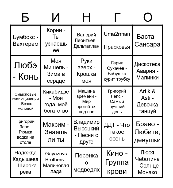 This bingo card has 70 words: 33 коровы, Artik & Asti - Девочка танцуй, Dabro - Юность, Galibri & Mavik - Федерико Феллини, Gayazovs Brothers - Малиновая лада, Serebro - Мама Люба, Uma2rman - Прасковья, Алла Пугачёва - А знаешь, всё ещё будет, Баста - Сансара, Белый орёл - Как упоительны…, Браво - Любите, девушки, Братья Грим - Ресницы, Бумбокс - Вахтёрам, Валерий Леонтьев - Дельтаплан, Валерий Меладзе - Салют, Вера, Кикабидзе - Мои года, моё богатство, Владимир Высоцкий - Песня о друге, Гарик Сукачёв - Бабушка курит трубку, Глюкоза - Невеста, Григорий Лепс - Рюмка водки на столе, Григорий Лепс - Самый лучший день, ДДТ - Что такое осень, Дискотека Авария - Малинки, Ёлка - Прованс, Звери - Районы-кварталы, Земляне - Трава у дома, Земфира - Хочешь, IOWA - Маршрутка, Кино - Группа крови, Комбинация - Два кусочЕка колбаски, Корни - Ты узнаешь её, Король и шут - Ели мясо мужики, Крис Кельми - Замыкая круг, Лариса Долина - Погода в доме, Ласковый май - Седая ночь, Леонид Агутин - На сиреневой луне, Леприконсы - Хали-гали, паратрупер, Лидия Русланова - Валенки, Луч солнца золотого, Любэ - Конь, Люся Чеботина - Солнце Монако, Максим - Знаешь ли ты, Машина времени - Мир прогнётся под нас, Митя Фомин - Всё будет хорошо, Михаил Боярский - Зеленоглазое такси, Моя Мишель - Зима в сердце, Надежда Кадышева - Широка река, Ничего на свете лучше нету, Ой, мороз, мороз, Олег Митяев - Как здорово, От улыбки станет всем светлей, Павел Смеян - Ветер перемен, Пелагея - Ой, да не вечер, Песенка крокодила Гены, Песенка о медведях, Разговор со счастьем, Руки вверх - Крошка моя, Секрет - Моя любовь на 5-м этаже, Сергей Трофимов - Ветер в голове, Сливки - Куда уходит детство, Смысловые галлюцинации - Вечно молодой, Сплин - Моё сердце, Старый клён, Татьяна Куртукова - Матушка-земля, Филипп Киркоров - Диско-партизаны, Хабиб - Ягода малинка, Чиж - О любви, Чунга-чанга, Юрий Визбор — Милая моя and Юрий Лоза - Плот.