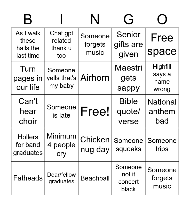 This bingo card has a free space and 25 words: Minimum 4 people cry, Beachball, Airhorn, Fatheads, Free space, As I walk these halls the last time, Turn pages in our life, Chat gpt related thank u too, Bible quote/ verse, Chicken nug day, Maestri gets sappy, Can't hear choir, Someone squeaks, Someone trips, Someone yells that's my baby, Maestri messes up/ play at wrong time, National anthem bad, Someone forgets music, Highfill says a name wrong, Someone is late, Someone forgets music, Dear/fellow graduates, Hollers for band graduates, Senior gifts are given and Someone not it concert black.