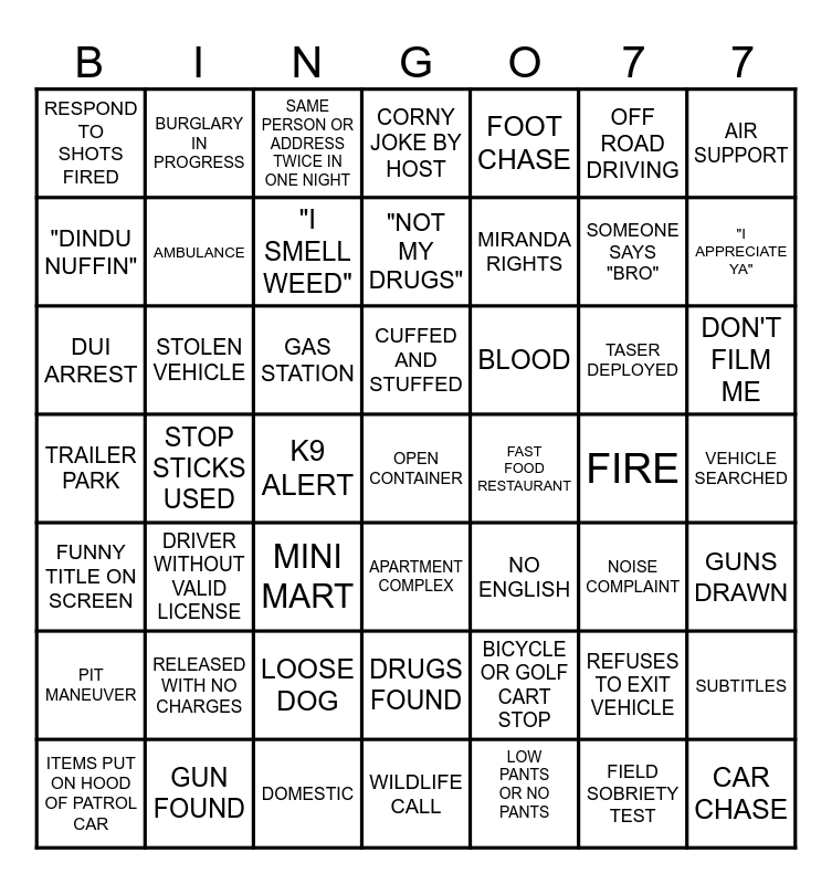 This bingo card has 56 words: FIELD SOBRIETY TEST, DON'T FILM ME, K9 DEPLOYED, RESPOND TO SHOTS FIRED, STOP STICKS USED, LOOSE DOG, AIR SUPPORT, ACTIVE WARRANT, AMBULANCE, DRUGS FOUND, CORNY JOKE BY HOST, PIT MANEUVER, FUNNY TITLE ON SCREEN, VEHICLE SEARCHED, GUN FOUND, DRIVER WITHOUT VALID LICENSE, FOOT CHASE, MIRANDA RIGHTS, CAR CHASE, SOMEONE SAYS "BRO", "I APPRECIATE YA", MINI MART, BLOOD, SAME PERSON OR ADDRESS TWICE IN ONE NIGHT, CAR CRASH, "DINDU NUFFIN", FIRE, SHIRTLESS MAN, "I SMELL WEED", APARTMENT COMPLEX, WAD OF CASH, GUNS DRAWN, ITEMS PUT ON HOOD OF PATROL CAR, DOMESTIC, DUI ARREST, OFF ROAD DRIVING, "NOT MY DRUGS", RELEASED WITH NO CHARGES, STOLEN VEHICLE, BURGLARY IN PROGRESS, CUFFED AND STUFFED, OPEN CONTAINER, BICYCLE OR GOLF CART STOP, FIRE TRUCK, SUBTITLES, GAS STATION, TRAILER PARK, WILDLIFE CALL, NOISE COMPLAINT, FAST FOOD RESTAURANT, K9 ALERT, NO ENGLISH, REFUSES TO EXIT VEHICLE, LOW PANTS OR NO PANTS, TASER DEPLOYED and SHELL CASINGS FOUND.