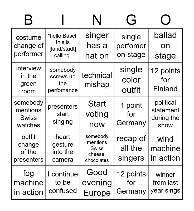 This bingo card has 38 words: drone shot from Basel, song in more than one language, every vote counts, somebody screws up the perfomance, wind machine in action, heart gesture into the camera, technical mishap, commentator making a bad joke, ballad on stage, single color outfit, presenters start singing, single perfomer on stage, Start voting now, political statement during the show, interview in the green room, outfit change of the presenters, pyro technics in action, singer has a hat on, somebody rapped during the song, 1 point for Germany, costume change of performer, I continue to be confused, 12 points for Finland, fog machine in action, there are more than 5 people on stage, Good evening Europe, winner from last year sings, pyrotechnics in action, single singer on stage, tragic backstory to the song, neighbor country gives 12 points, somebody mentions Swiss cheese, chocolates, 12 points for Germany, "hello Basel, this is [land/stadt] calling", singer lies on the floor, recap of all the singers, somebody mentions Swiss watches and voting system gets explained.