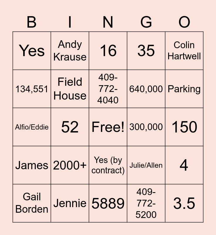 This bingo card has a free space and 24 words: 2000+, Jennie, 409-772-4040, Gail Borden, Colin Hartwell, Yes, 134,551, Andy Krause, 300,000, Yes (by contract), 640,000, Alfio/Eddie, Julie/Allen, 4, Field House, 409-772-5200, 150, 16, Parking, 52, 3.5, James, 35 and 5889.