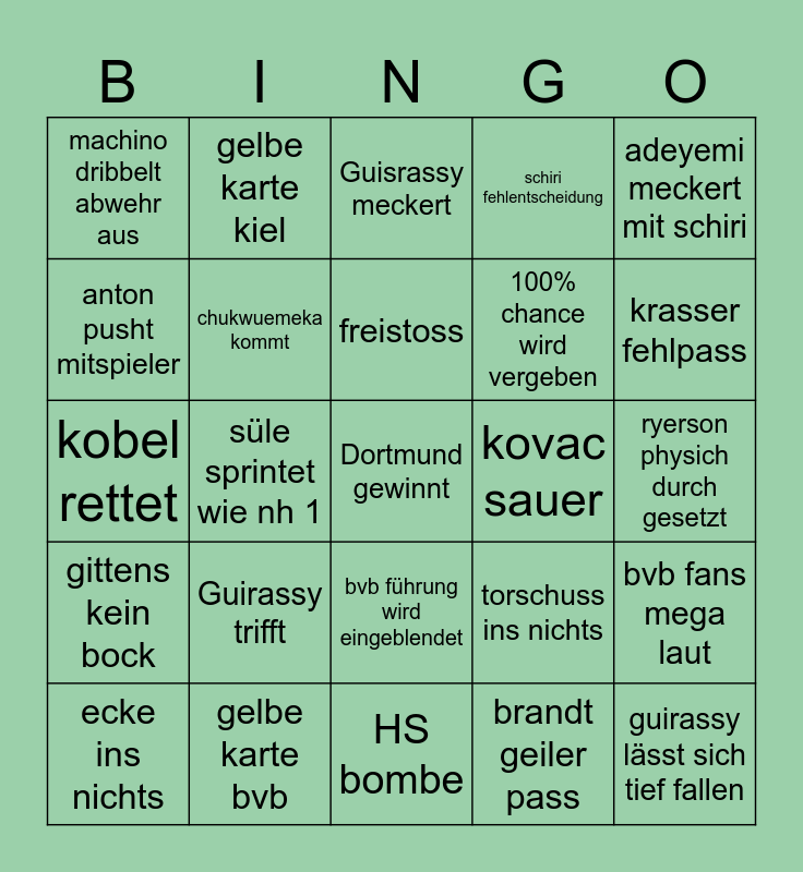 This bingo card has a free space and 24 words: Guirassy trifft, gelbe karte bvb, freistoss, ecke ins nichts, adeyemi meckert mit schiri, machino dribbelt abwehr aus, anton pusht mitspieler, gelbe karte kiel, kovac sauer, bvb führung wird eingeblendet, 100% chance wird vergeben, kobel rettet, torschuss ins nichts, bvb fans mega laut, chukwuemeka kommt, brandt geiler pass, ryerson physich durch gesetzt, Guisrassy meckert, krasser fehlpass, süle sprintet wie nh 1, guirassy lässt sich tief fallen, gittens kein bock, schiri fehlentscheidung and HS bombe.