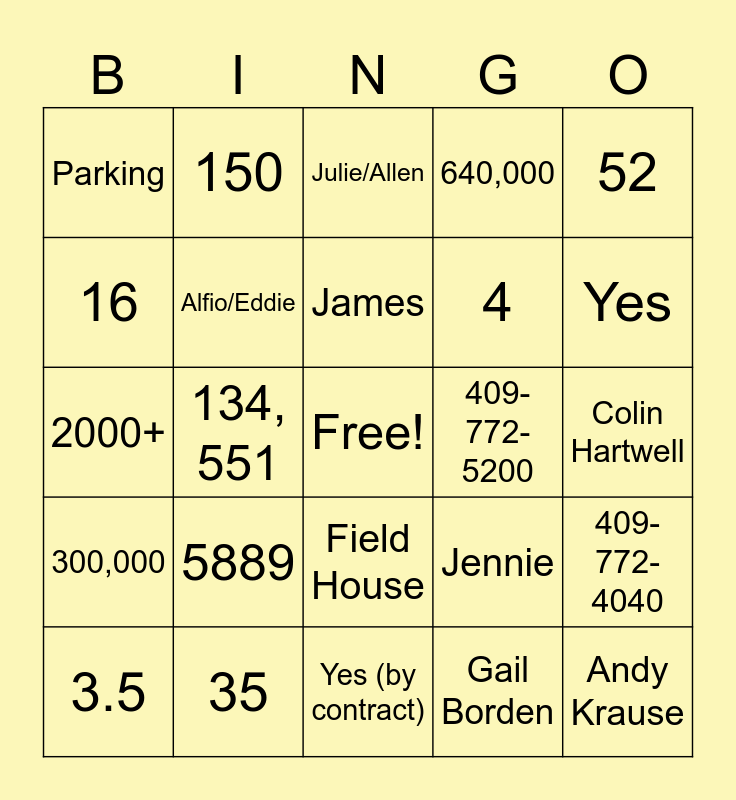 This bingo card has a free space and 24 words: 5889, 35, James, 3.5, 52, Parking, 16, 150, 409-772-5200, Field House, 4, 2000+, Jennie, 409-772-4040, Alfio/Eddie, Gail Borden, Colin Hartwell, Julie/Allen, Yes, 134, 551, Andy Krause, 300,000, 640,000 and Yes (by contract).