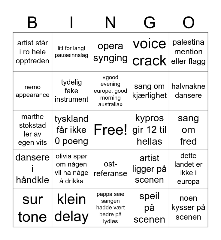 This bingo card has a free space and 35 words: celine dion mention, null poeng, buing, tydelig fake instrument, ost-referanse, voice crack, nemo appearance, gay joke, «good evening europe, good morning australia», marthe stokstad sier noe shady, marthe stokstad ler av egen vits, palestina mention eller flagg, laaaang high note, kamera feiler, artist står i ro hele opptreden, kypros gir 12 til hellas, speil på scenen, tyskland får ikke 0 poeng, dansere i håndkle, noen kysser på scenen, artist ligger på scenen, sur tone, dette landet er ikke i europa, klein delay, opera synging, halvnakne dansere, noen gråter lykketårer, mye pyro, sang om kjærlighet, sang om fred, sang om forelder, pappa seie sangen hadde vært bedre på lydløs, olivia spør om någen vil ha någe å drikka, litt for langt pauseinnslag and outfit change.