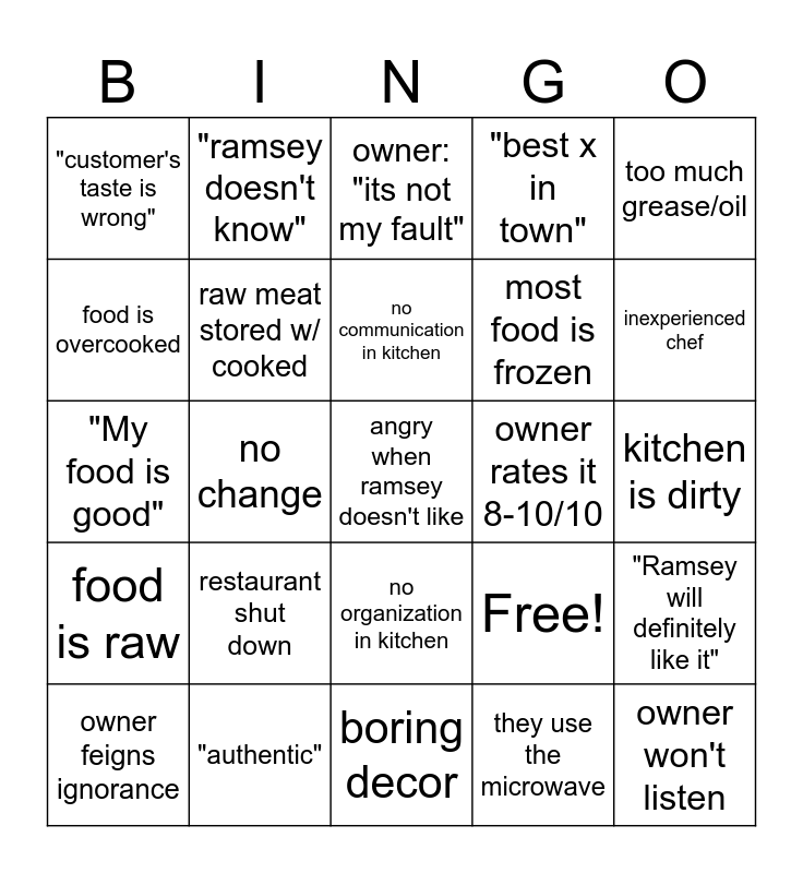 This bingo card has 25 words: restaurant shut down, boring decor, no communication in kitchen, owner feigns ignorance, too much grease/oil, "customer's taste is wrong", food is overcooked, "ramsey doesn't know", owner rates it 8-10/10, no organization in kitchen, most food is frozen, "My food is good", Free!, "Ramsey will definitely like it", raw meat stored w/ cooked, owner won't listen, kitchen is dirty, owner: "its not my fault", inexperienced chef, no change, angry when ramsey doesn't like, "authentic", food is raw, "best x in town" and they use the microwave.