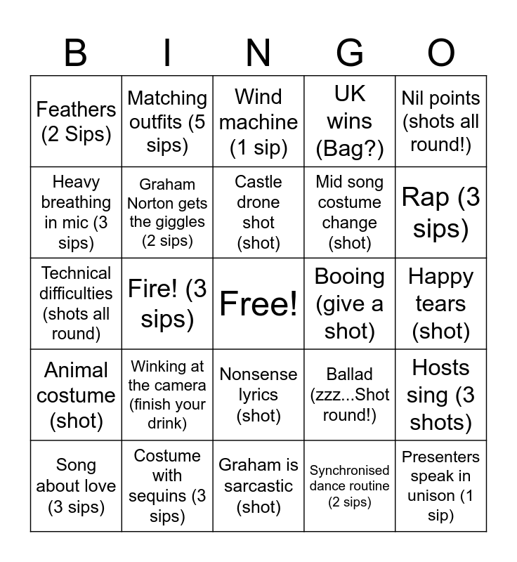 This bingo card has a free space and 43 words: Key change (1 sip), Presenters speak in unison (1 sip), Song about food (3 sips), Song about love (3 sips), Singing out of tune (shots all round), Synchronised dance routine (2 sips), Wind machine (1 sip), contestant plays an instrument (1 sip), Nil points (shots all round!), Costume with sequins (3 sips), UK wins (Bag?), Booing (give a shot), Nonsense lyrics (shot), Winking at the camera (finish your drink), Fake rain (shot), Graham is sarcastic (shot), Pleather outfit (finish your drink), Technical difficulties (shots all round), Presenter outfit change (shot), Rap (3 sips), Matching outfits (5 sips), Flag face paint (5 sips), Awkward time delay (5 sips), Feathers (2 Sips), Lasers (2 sips), Happy tears (shot), "Thank you Europe" (1 sip), Solo act (5 sips), Ballad (zzz...Shot round!), Animal costume (shot), Bad fake tan (3 shot), Hosts sing (3 shots), traditional outfit (5 sips), Fire! (3 sips), Eurovision app promotion (3 sips), Air grab by performer (3 sips), Light up costume (shot), Castle drone shot (shot), Heavy breathing in mic (3 sips), Mid song costume change (shot), Ridiculous contestant name (shots all round), Graham Norton gets the giggles (2 sips) and Hug (5 sips).