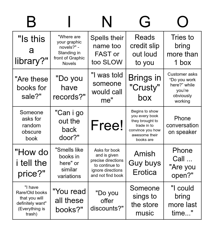 This bingo card has a free space and 24 words: "Smells like books in here" or similar variations, "You read all these books?", "I was told someone would call me", "I have Rare/Old books that you will definitely want" (Everything is trash), Tries to bring more than 1 box, "Is this a library?", "Are these books for sale?", "Where are your graphic novels?" - Standing in front of Graphic Novels, Begins to show you every book they brought to trade in to convince you how awesome their books are, Asks for book and is given precise directions to continue to ignore directions and not find book, Brings in "Crusty" box, Someone asks for random obscure book, Amish Guy buys Erotica, Phone Call ... "Are you open?", "Do you have records?", Someone sings to the store music, Phone conversation on speaker, Spells their name too FAST or too SLOW, Customer asks “Do you work here?” while you’re obviously working, "Can i go out the back door?", "I could bring more last time...", "How do i tell the price?", Reads credit slip out loud to you and "Do you offer discounts?".