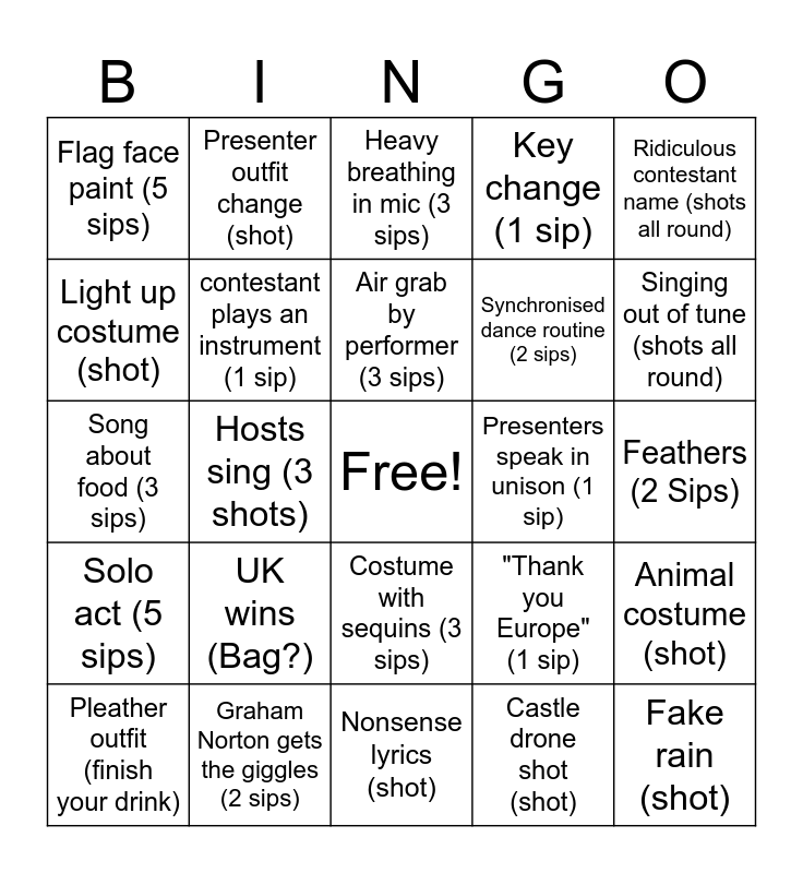 This bingo card has a free space and 43 words: Winking at the camera (finish your drink), Fake rain (shot), Graham is sarcastic (shot), Pleather outfit (finish your drink), Technical difficulties (shots all round), Castle drone shot (shot), Heavy breathing in mic (3 sips), Mid song costume change (shot), Ridiculous contestant name (shots all round), Graham Norton gets the giggles (2 sips), Key change (1 sip), Presenters speak in unison (1 sip), Costume with sequins (3 sips), UK wins (Bag?), Booing (give a shot), Nonsense lyrics (shot), Hug (5 sips), Song about food (3 sips), Song about love (3 sips), Singing out of tune (shots all round), Presenter outfit change (shot), Rap (3 sips), Matching outfits (5 sips), Flag face paint (5 sips), Awkward time delay (5 sips), Feathers (2 Sips), Lasers (2 sips), Happy tears (shot), "Thank you Europe" (1 sip), Solo act (5 sips), Ballad (zzz...Shot round!), Animal costume (shot), Bad fake tan (3 shot), Hosts sing (3 shots), traditional outfit (5 sips), Fire! (3 sips), Eurovision app promotion (3 sips), Air grab by performer (3 sips), Light up costume (shot), Synchronised dance routine (2 sips), Wind machine (1 sip), contestant plays an instrument (1 sip) and Nil points (shots all round!).