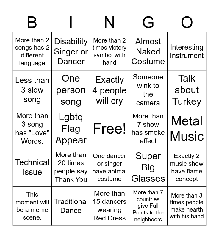 This bingo card has a free space and 24 words: More than 20 times people say Thank You, Traditional Dance, Exactly 4 people will cry, This moment will be a meme scene., Interesting Instrument, More than 2 songs has 2 different language, Less than 3 slow song, Disability Singer or Dancer, More than 7 show has smoke effect, One dancer or singer have animal costume, Someone wink to the camera, More than 3 song has "Love" Words., Super Big Glasses, Exactly 2 music show have flame concept, One person song, More than 7 countries give Full Points to the neighboors, Metal Music, More than 2 times victory symbol with hand, Talk about Turkey, Lgbtq Flag Appear, More than 3 times people make hearth with his hand, Technical Issue, Almost Naked Costume and More than 15 dancers wearing Red Dress.