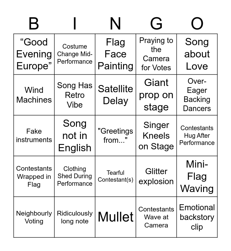 This bingo card has 37 words: Free!, “Every Vote Counts!”, Out-of-Tune Singing, Song Has Retro Vibe, Mini-Flag Waving, Clothing Shed During Performance, Satellite Delay, Stage Fog, Song about Love, Technical Glitch, Song not in English, Praying to the Camera for Votes, "Greetings from...", Contestants Hug After Performance, Wind Machines, Contestants Wrapped in Flag, Singer Finishes with Raised Fist, Flag Face Painting, Tearful Contestant(s), Singer Kneels on Stage, “Good Evening Europe”, Over-Eager Backing Dancers, Neighbourly Voting, Mullet, Performer in Glasses, Contestants Wave at Camera, Costume Change Mid-Performance, Shirtless male dancer(s), Awkward banter from hosts, The performer winks at the camera, Country gets “nul points”, Ridiculously long note, Fake instruments, Emotional backstory clip, Glitter explosion, Giant prop on stage and Dance solo.