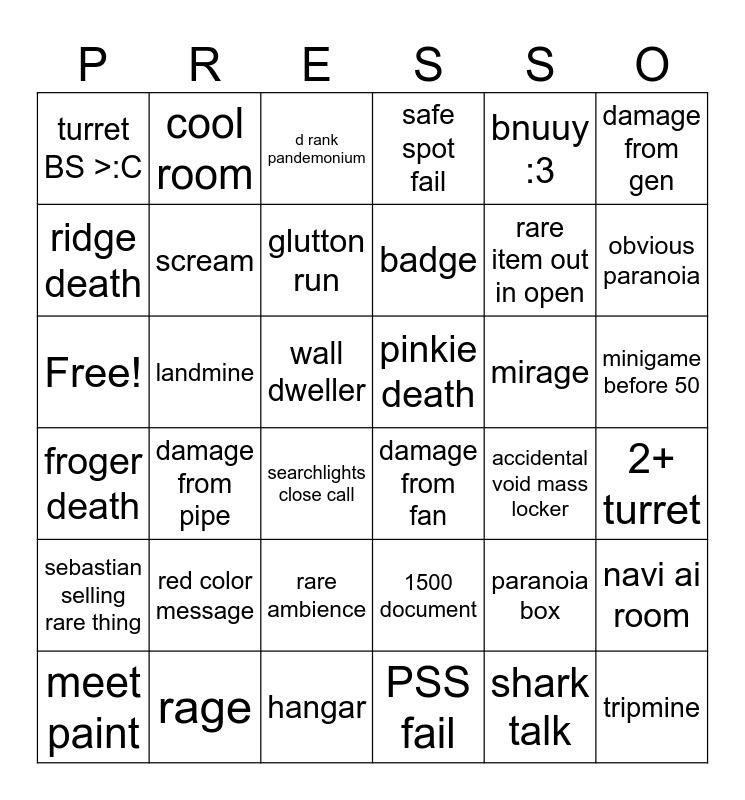 This bingo card has 36 words: 1500 document, rare ambience, PSS fail, ridge death, froger death, pinkie death, scream, hangar, bnuuy :3, paranoia box, obvious paranoia, safe spot fail, navi ai room, landmine, badge, turret BS >:C, sebastian selling rare thing, mirage, Free!, d rank pandemonium, wall dweller, damage from pipe, damage from fan, searchlights close call, accidental void mass locker, cool room, rare item out in open, rage, glutton run, damage from gen, tripmine, meet paint, 2+ turret, minigame before 50, red color message and shark talk.