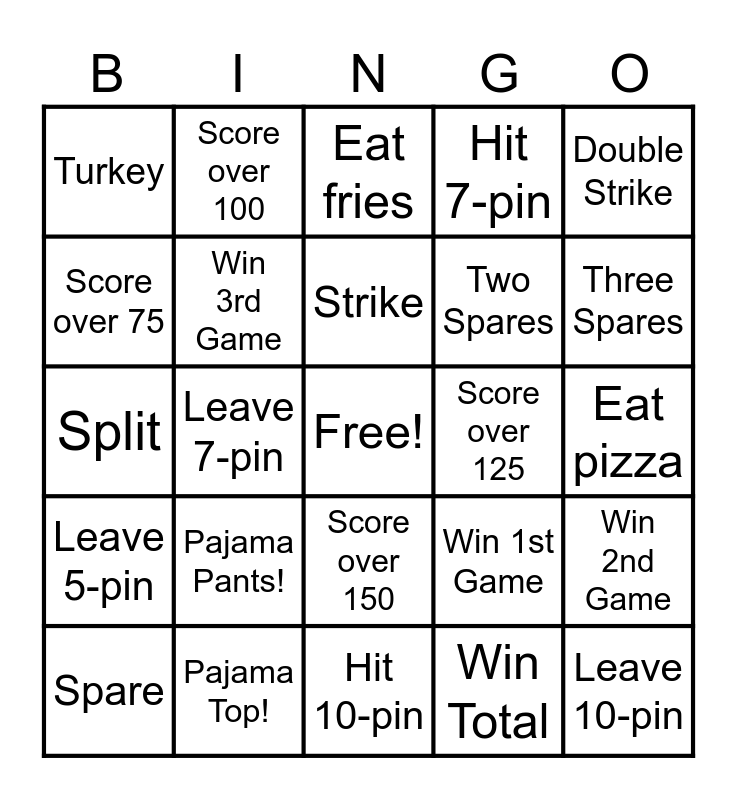 This bingo card has a free space and 24 words: Pajama Pants!, Pajama Top!, Strike, Spare, Double Strike, Turkey, Score over 75, Score over 100, Score over 125, Score over 150, Two Spares, Split, Win 1st Game, Win 2nd Game, Win 3rd Game, Win Total, Eat pizza, Eat fries, Three Spares, Leave 7-pin, Leave 10-pin, Leave 5-pin, Hit 7-pin and Hit 10-pin.