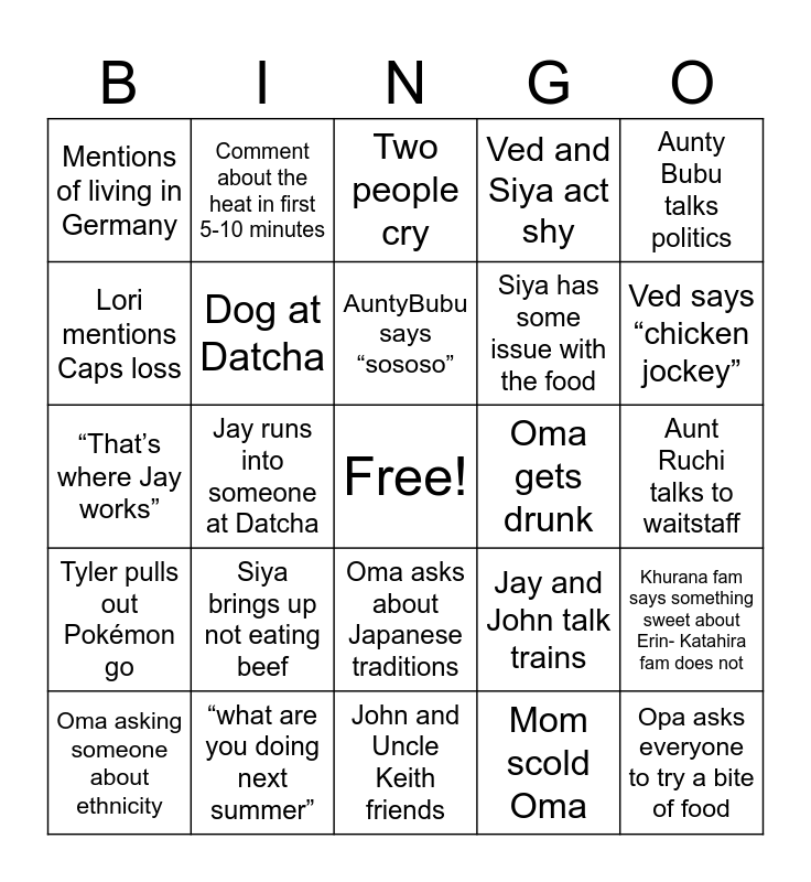 This bingo card has a free space and 24 words: Siya brings up not eating beef, “what are you doing next summer”, AuntyBubu says “sososo”, Oma asking someone about ethnicity, Aunty Bubu talks politics, Mentions of living in Germany, Lori mentions Caps loss, Comment about the heat in first 5-10 minutes, Oma gets drunk, Oma asks about Japanese traditions, Siya has some issue with the food, “That’s where Jay works”, Jay and John talk trains, Khurana fam says something sweet about Erin- Katahira fam does not, Dog at Datcha, Mom scold Oma, Aunt Ruchi talks to waitstaff, Two people cry, Ved says “chicken jockey”, Jay runs into someone at Datcha, Opa asks everyone to try a bite of food, Tyler pulls out Pokémon go, Ved and Siya act shy and John and Uncle Keith friends.