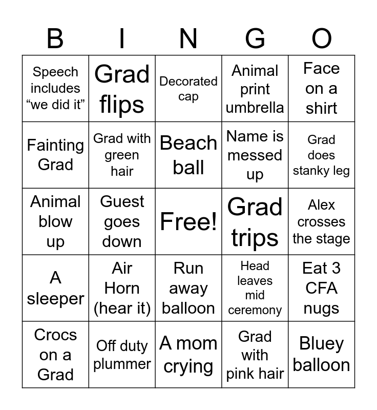This bingo card has a free space and 24 words: Air Horn (hear it), Off duty plummer, Beach ball, Crocs on a Grad, Face on a shirt, Speech includes “we did it”, Fainting Grad, Grad flips, Grad trips, Run away balloon, Name is messed up, Animal blow up, Head leaves mid ceremony, Eat 3 CFA nugs, Grad with green hair, Grad with pink hair, Alex crosses the stage, Decorated cap, Grad does stanky leg, Guest goes down, Bluey balloon, A sleeper, Animal print umbrella and A mom crying.