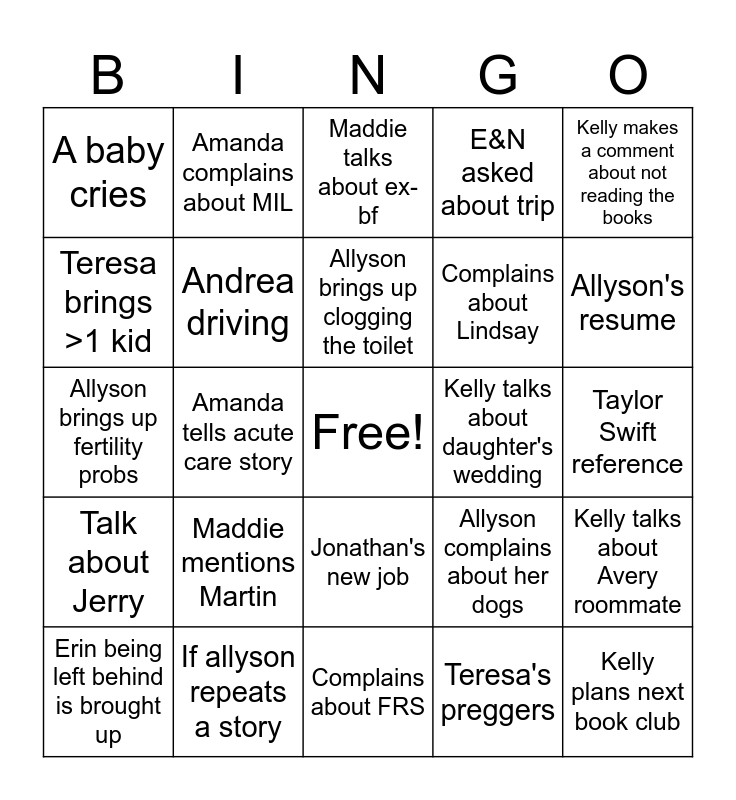 This bingo card has a free space and 24 words: Maddie mentions Martin, If allyson repeats a story, Allyson brings up clogging the toilet, Erin being left behind is brought up, Kelly makes a comment about not reading the books, A baby cries, Teresa brings >1 kid, Amanda complains about MIL, Kelly talks about daughter's wedding, Jonathan's new job, Complains about Lindsay, Allyson brings up fertility probs, Allyson complains about her dogs, Kelly talks about Avery roommate, Andrea driving, Teresa's preggers, Taylor Swift reference, Maddie talks about ex-bf, Allyson's resume, Amanda tells acute care story, Kelly plans next book club, Talk about Jerry, E&N asked about trip and Complains about FRS.
