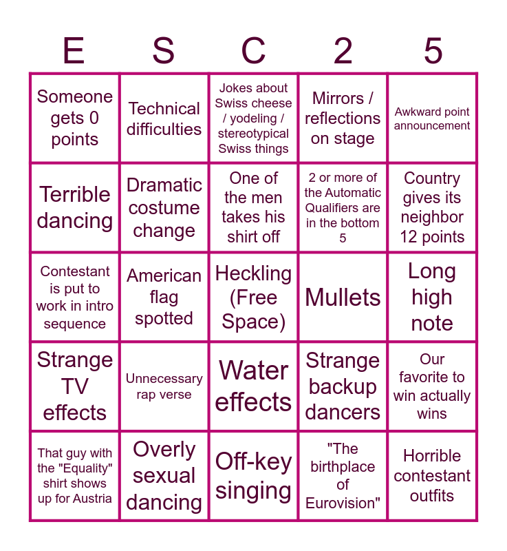 This bingo card has a free space and 48 words: Horrible host outfits, Horrible contestant outfits, Judges are clearly biased towards one country, Off-key singing, Unnecessary rap verse, Bad mixing / can't hear the singer, Technical difficulties, Pyrotechnics, Terrible dancing, Opera, Dramatic costume change, Mirrors / reflections on stage, Our favorite to win actually wins, Strange backup dancers, Boring ballad gets into top 5, Interesting makeup, One of the men takes his shirt off, Mullets, They bring back contestant from last year, Awkward point announcement, American flag spotted, "The birthplace of Eurovision", Someone gets 0 points, 2 or more of the Automatic Qualifiers are in the bottom 5, Sequins, Country gives its neighbor 12 points, That guy with the "Equality" shirt shows up for Austria, Feathers, Water effects, Strange TV effects, Awkward host moment, Shoulder pads, Someone cries, Sunglasses indoors, Overly sexual dancing, Strange camerawork, Glitter, Long high note, Yodeling, Traditional instrument, Audience member with flag painted on face, "Thank you Europe!", Jokes about Swiss cheese / yodeling / stereotypical Swiss things, Singer laying down onstage, Contestant is put to work in intro sequence, Clearly fake instrument playing, Hosts start singing and Our least favorite wins.