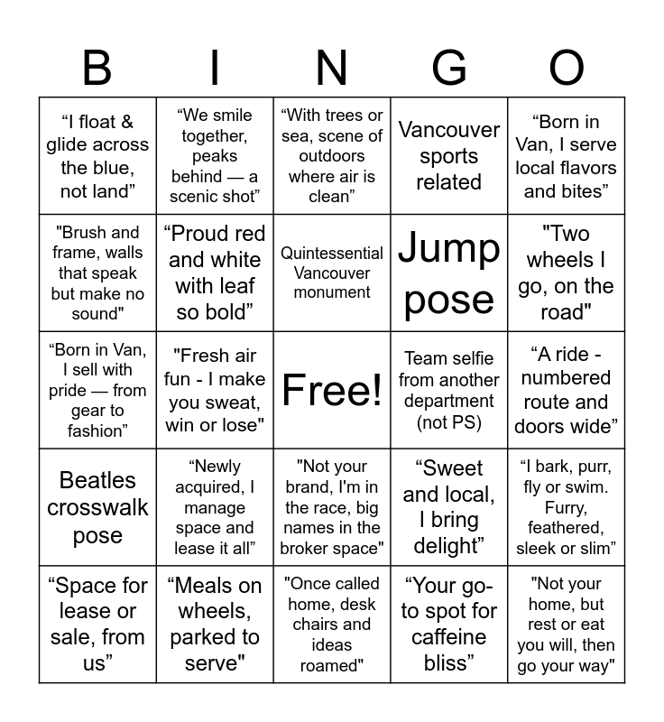 This bingo card has a free space and 24 words: “Space for lease or sale, from us”, “Newly acquired, I manage space and lease it all”, Quintessential Vancouver monument, “Your go-to spot for caffeine bliss”, “Born in Van, I serve local flavors and bites”, “I float & glide across the blue, not land”, “We smile together, peaks behind — a scenic shot”, “With trees or sea, scene of outdoors where air is clean”, Team selfie from another department (not PS), “A ride - numbered route and doors wide”, “Born in Van, I sell with pride — from gear to fashion”, “Proud red and white with leaf so bold”, “Sweet and local, I bring delight”, “I bark, purr, fly or swim. Furry, feathered, sleek or slim”, "Brush and frame, walls that speak but make no sound", “Meals on wheels, parked to serve", "Once called home, desk chairs and ideas roamed", Vancouver sports related, "Two wheels I go, on the road", Beatles crosswalk pose, "Fresh air fun - I make you sweat, win or lose", "Not your brand, I'm in the race, big names in the broker space", Jump pose and "Not your home, but rest or eat you will, then go your way".