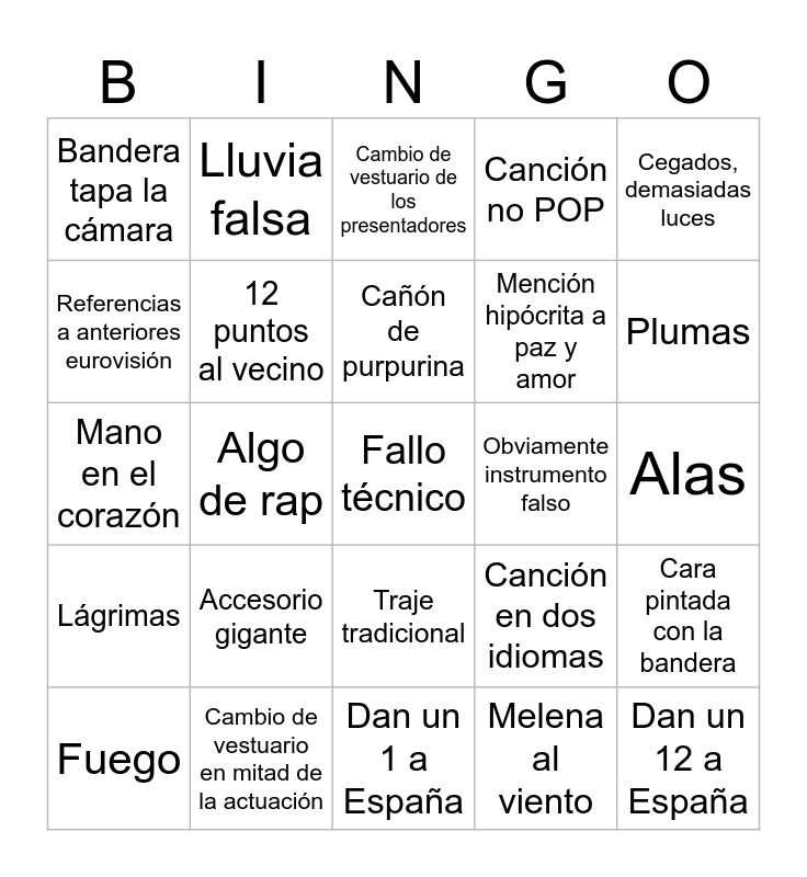 This bingo card has a free space and 29 words: Fuego, Gallo, Algo de rap, Bandera LGBT+, Bandera tapa la cámara, Cambio de vestuario de los presentadores, 12 puntos al vecino, Accesorio gigante, Obviamente instrumento falso, Cambio de vestuario en mitad de la actuación, Alas, Dan un 12 a España, Dan un 1 a España, Melena al viento, Plumas, Canción ñoña, Traje tradicional, Lágrimas, Cegados, demasiadas luces, Mano en el corazón, Canción en dos idiomas, Cantar con los ojos cerrados, Mención hipócrita a paz y amor, Referencias a anteriores eurovisión, Canción no POP, Lluvia falsa, Cara pintada con la bandera, Cañón de purpurina and 12 puntos a la pausa publicitaria.