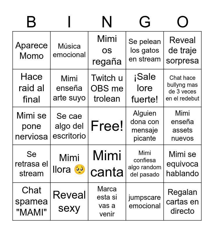 This bingo card has a free space and 24 words: Mimi llora 🥺, Reveal sexy, Twitch u OBS me trolean, Chat spamea "MAMI", Reveal de traje sorpresa, Aparece Momo, Hace raid al final, Música emocional, Alguien dona con mensaje picante, Mimi canta, ¡Sale lore fuerte!, Mimi se pone nerviosa, Mimi confiesa algo random del pasado, Mimi se equivoca hablando, Mimi enseña arte suyo, jumpscare emocional, Mimi enseña assets nuevos, Mimi os regaña, Chat hace bullyng mas de 3 veces en el redebut, Se cae algo del escritorio, Regalan cartas en directo, Se retrasa el stream, Se pelean los gatos en stream and Marca esta si vas a venir.