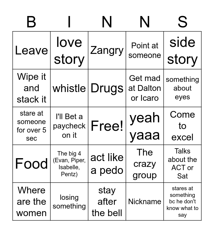 This bingo card has a free space and 34 words: America, Nickname, Don't speak to me, Door or window, Food, whistle, side story, Where are the women, love story, Doctor, Drugs, Zangry, Excel detention, Bright angel, yeah yaaa, something about eyes, losing something, stare at someone for over 5 sec, The big 4 (Evan, Piper, Isabelle, Pentz), The crazy group, act like a pedo, New York Reference, Leave, Come to excel, stay after the bell, stares at something bc he don't know what to say, Point at someone, Reference to someone he had like years ago, Get mad at Dalton or Icaro, Wipe it and stack it, Go to C-Pod, I'll Bet a paycheck on it, Talks about the ACT or Sat and Talks about another Teacher.
