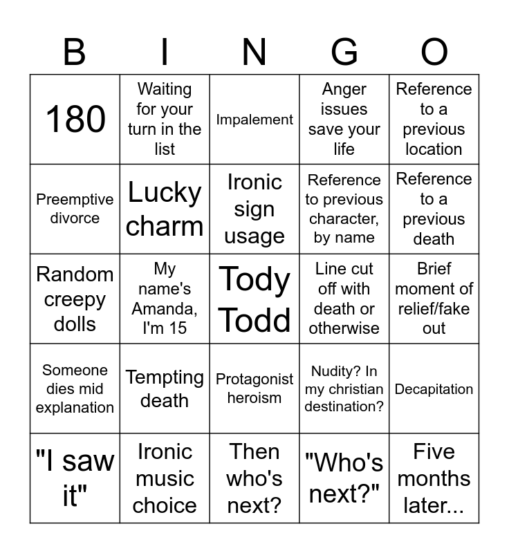 This bingo card has a free space and 29 words: "I saw it", There was this high school french class, My name's Amanda, I'm 15, McKinley Reference, 180, Impalement, Lucky charm, Tempting death, Line cut off with death or otherwise, Ironic music choice, Brief moment of relief/fake out, Five months later..., Then who's next?, "Who's next?", Reference to a previous death, Montage intro, Protagonist heroism, Someone dies mid explanation, Reference to a previous location, Random creepy dolls, Nudity? In my christian destination?, Mortician whistling, Reference to previous character, by name, Preemptive divorce, Anger issues save your life, Waiting for your turn in the list, Decapitation, Ironic sign usage and CNN news report.