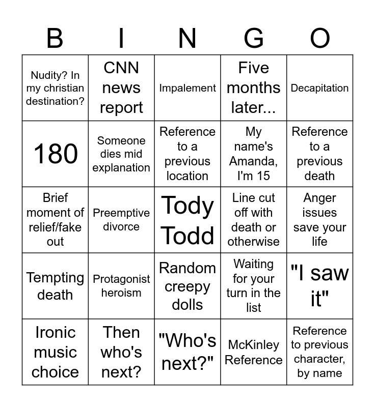 This bingo card has a free space and 28 words: "I saw it", There was this high school french class, My name's Amanda, I'm 15, McKinley Reference, 180, Impalement, CNN news report, Tempting death, Line cut off with death or otherwise, Ironic music choice, Brief moment of relief/fake out, Five months later..., Then who's next?, "Who's next?", Reference to a previous death, Montage intro, Protagonist heroism, Someone dies mid explanation, Reference to a previous location, Random creepy dolls, Nudity? In my christian destination?, Mortician whistling, Reference to previous character, by name, Preemptive divorce, Anger issues save your life, Waiting for your turn in the list, Decapitation and Ironic sign usage.