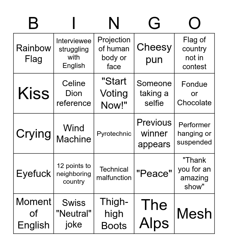This bingo card has a free space and 29 words: Moment of English, Key Change, Wind Machine, Costume Change, Rainbow Flag, Projection of human body or face, Celine Dion reference, 12 points to neighboring country, Previous winner appears, Swiss "Neutral" joke, Performer hanging or suspended, Mesh, Thigh-high Boots, The Alps, Fondue or Chocolate, "Thank you Europe", Technical malfunction, Eyefuck, Flag of country not in contest, Crying, "Peace", People inside boxes, Someone taking a selfie, Kiss, Cheesy pun, Interviewee struggling with English, "Thank you for an amazing show", "Start Voting Now!" and Reference to first ever Eurovision.