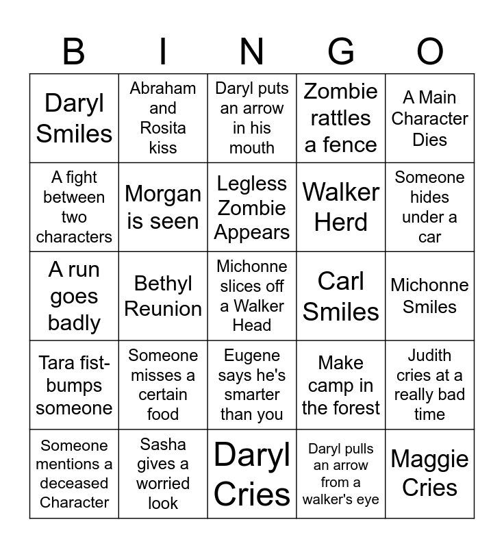 This bingo card has a free space and 24 words: Someone misses a certain food, Sasha gives a worried look, Legless Zombie Appears, Someone mentions a deceased Character, A Main Character Dies, Daryl Smiles, A fight between two characters, Abraham and Rosita kiss, Carl Smiles, Eugene says he's smarter than you, Walker Herd, A run goes badly, Make camp in the forest, Judith cries at a really bad time, Morgan is seen, Daryl pulls an arrow from a walker's eye, Michonne Smiles, Daryl puts an arrow in his mouth, Someone hides under a car, Bethyl Reunion, Maggie Cries, Tara fist-bumps someone, Zombie rattles a fence and Daryl Cries.