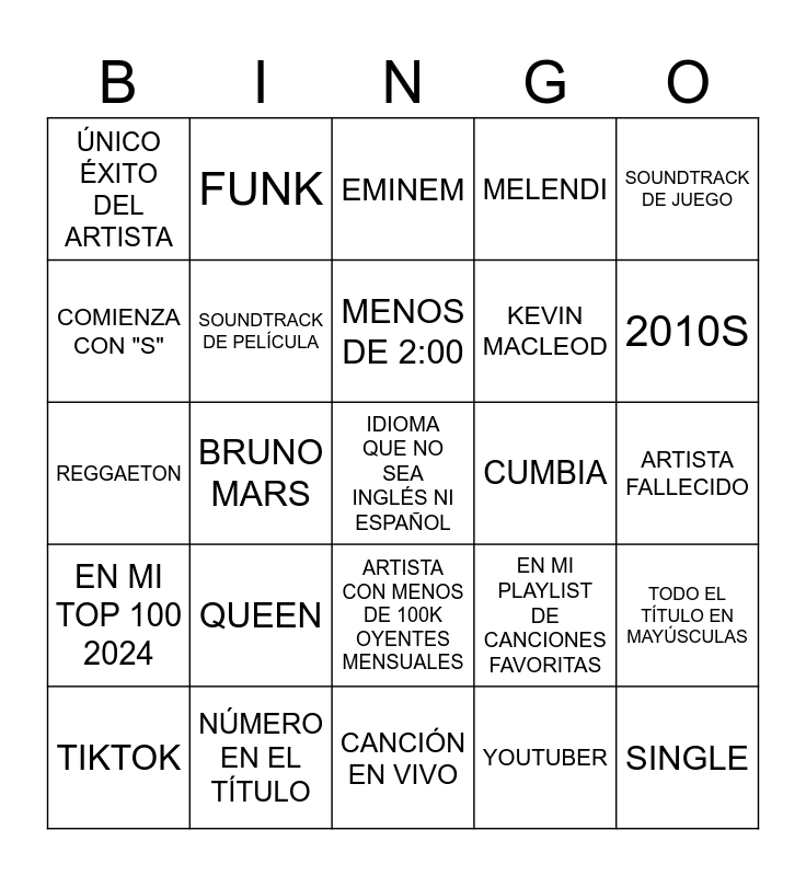 This bingo card has a free space and 24 words: QUEEN, NÚMERO EN EL TÍTULO, MENOS DE 2:00, TIKTOK, SOUNDTRACK DE JUEGO, ÚNICO ÉXITO DEL ARTISTA, COMIENZA CON "S", FUNK, CUMBIA, ARTISTA CON MENOS DE 100K OYENTES MENSUALES, KEVIN MACLEOD, REGGAETON, EN MI PLAYLIST DE CANCIONES FAVORITAS, TODO EL TÍTULO EN MAYÚSCULAS, SOUNDTRACK DE PELÍCULA, YOUTUBER, ARTISTA FALLECIDO, EMINEM, 2010S, BRUNO MARS, SINGLE, EN MI TOP 100 2024, MELENDI and CANCIÓN EN VIVO.