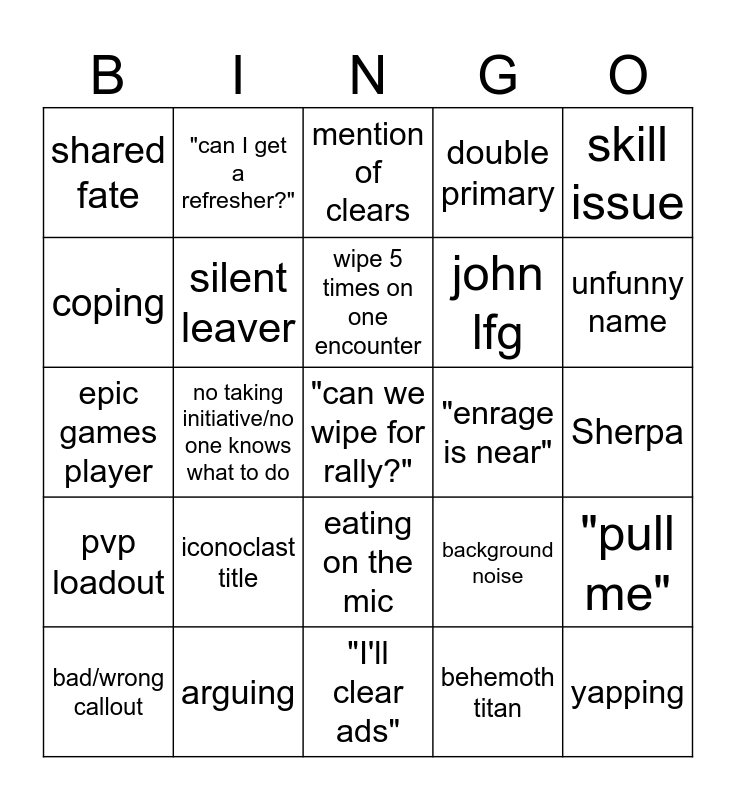 This bingo card has 25 words: iconoclast title, "I'll clear ads", wipe 5 times on one encounter, bad/wrong callout, skill issue, shared fate, coping, "can I get a refresher?", "enrage is near", eating on the mic, john lfg, epic games player, background noise, "pull me", silent leaver, yapping, Sherpa, mention of clears, unfunny name, no taking initiative/no one knows what to do, "can we wipe for rally?", arguing, pvp loadout, double primary and behemoth titan.