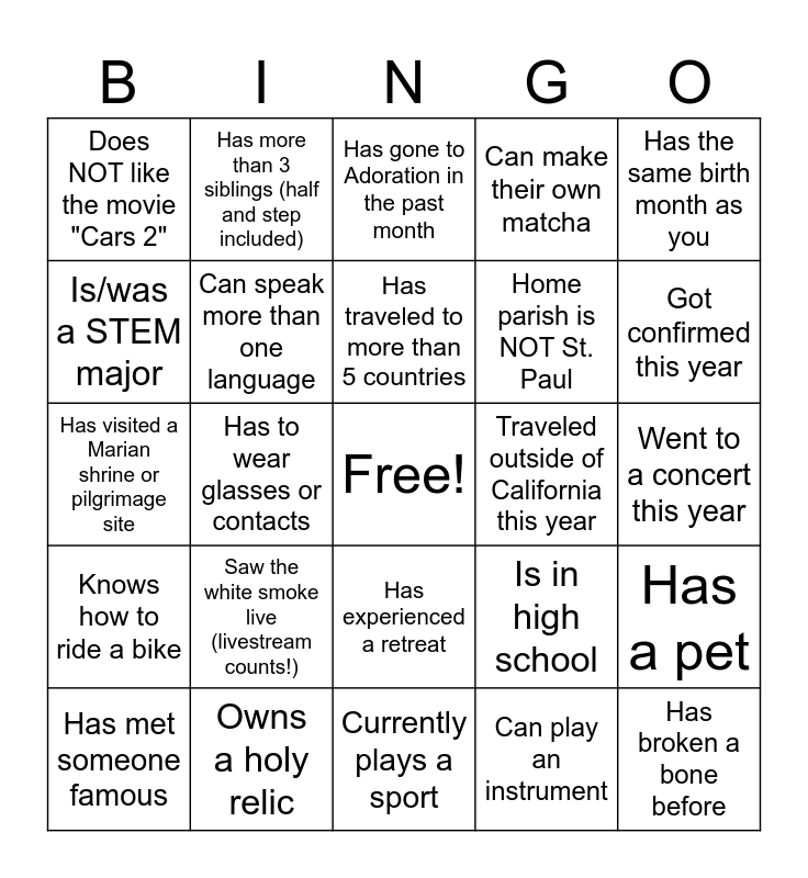 This bingo card has a free space and 24 words: Saw the white smoke live (livestream counts!), Owns a holy relic, Has traveled to more than 5 countries, Has met someone famous, Has the same birth month as you, Does NOT like the movie "Cars 2", Is/was a STEM major, Has more than 3 siblings (half and step included), Traveled outside of California this year, Has experienced a retreat, Home parish is NOT St. Paul, Has visited a Marian shrine or pilgrimage site, Is in high school, Has a pet, Can speak more than one language, Can play an instrument, Went to a concert this year, Has gone to Adoration in the past month, Got confirmed this year, Has to wear glasses or contacts, Has broken a bone before, Knows how to ride a bike, Can make their own matcha and Currently plays a sport.