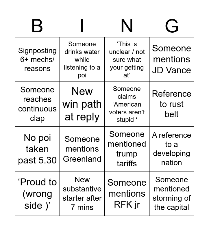 This bingo card has 16 words: New substantive starter after 7 mins, A reference to a developing nation, ‘This is unclear / not sure what your getting at’, Signposting 6+ mechs/ reasons, No poi taken past 5.30, Someone drinks water while listening to a poi, Someone mentioned trump tariffs, Someone mentions RFK jr, Someone reaches continuous clap, New win path at reply, ‘Proud to (wrong side )’, Someone mentions JD Vance, Someone mentions Greenland, Reference to rust belt, Someone claims ‘American voters aren’t stupid ‘ and Someone mentioned storming of the capital.
