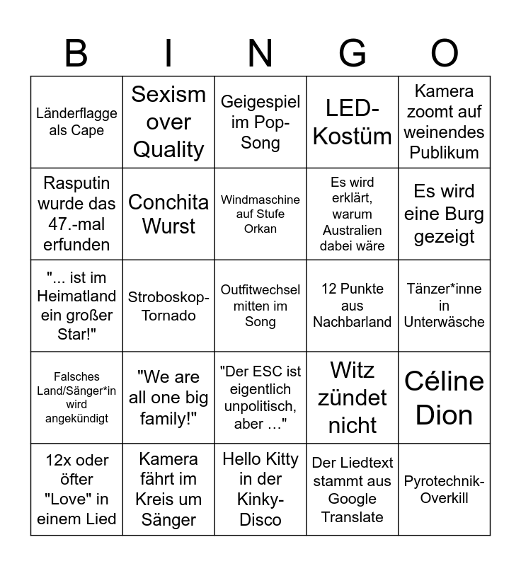 This bingo card has 25 words: "We are all one big family!", Hello Kitty in der Kinky-Disco, Windmaschine auf Stufe Orkan, 12x oder öfter "Love" in einem Lied, Kamera zoomt auf weinendes Publikum, Länderflagge als Cape, Rasputin wurde das 47.-mal erfunden, Sexism over Quality, 12 Punkte aus Nachbarland, "Der ESC ist eigentlich unpolitisch, aber …", Es wird erklärt, warum Australien dabei wäre, "... ist im Heimatland ein großer Star!", Witz zündet nicht, Céline Dion, Conchita Wurst, Pyrotechnik-Overkill, Tänzer*inne in Unterwäsche, Geigespiel im Pop-Song, Es wird eine Burg gezeigt, Stroboskop-Tornado, Outfitwechsel mitten im Song, Kamera fährt im Kreis um Sänger, Falsches Land/Sänger*in wird angekündigt, LED-Kostüm and Der Liedtext stammt aus Google Translate.