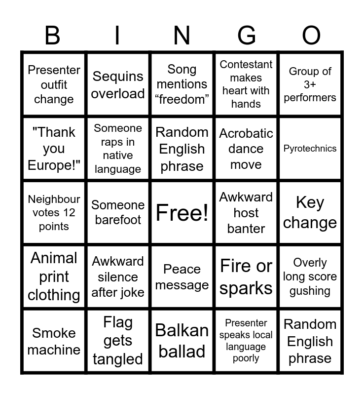 This bingo card has a free space and 24 words: Awkward silence after joke, Flag gets tangled, Random English phrase, Smoke machine, Group of 3+ performers, Presenter outfit change, "Thank you Europe!", Sequins overload, Awkward host banter, Peace message, Acrobatic dance move, Neighbour votes 12 points, Fire or sparks, Overly long score gushing, Someone raps in native language, Presenter speaks local language poorly, Key change, Song mentions “freedom”, Pyrotechnics, Someone barefoot, Random English phrase, Animal print clothing, Contestant makes heart with hands and Balkan ballad.