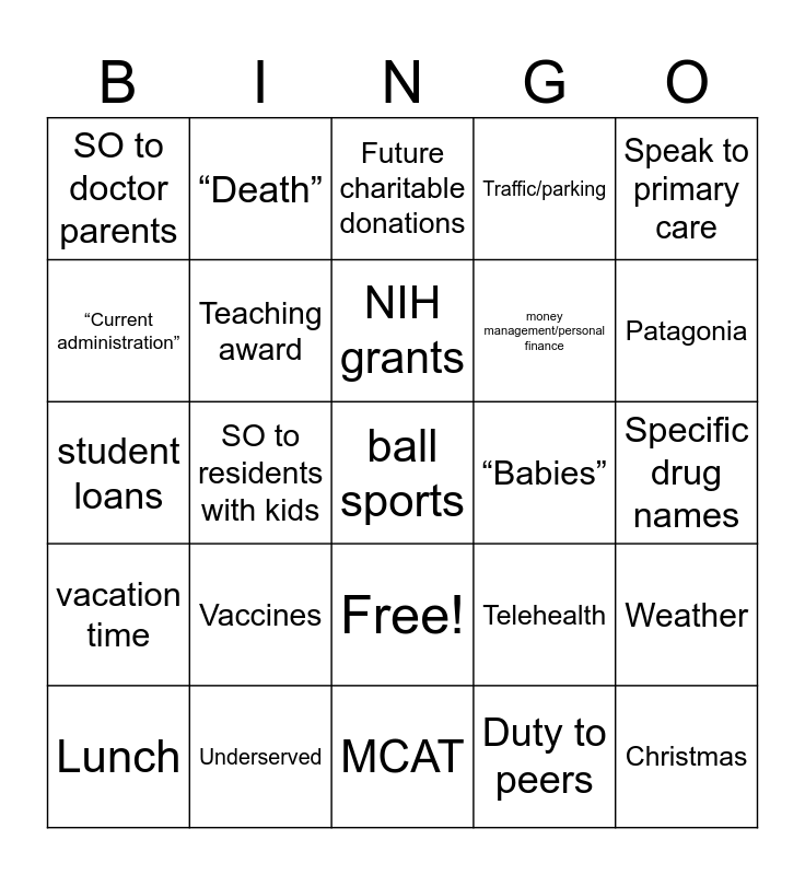 This bingo card has 26 words: Free!, Duty to peers, NIH grants, Underserved, Speak to primary care, SO to doctor parents, “Current administration”, “Death”, Specific drug names, Telehealth, money management/personal finance, student loans, Weather, Lunch, SO to residents with kids, Specific alcohols, Traffic/parking, vacation time, Future charitable donations, ball sports, Patagonia, MCAT, “Babies”, Vaccines, Teaching award and Christmas.