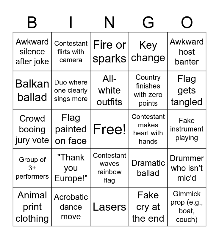 This bingo card has a free space and 24 words: "Thank you Europe!", Acrobatic dance move, All-white outfits, Animal print clothing, Awkward host banter, Awkward silence after joke, Balkan ballad, Contestant flirts with camera, Contestant makes heart with hands, Contestant waves rainbow flag, Country finishes with zero points, Crowd booing jury vote, Dramatic ballad, Drummer who isn’t mic’d, Duo where one clearly sings more, Fake cry at the end, Fake instrument playing, Fire or sparks, Flag gets tangled, Flag painted on face, Gimmick prop (e.g., boat, couch), Group of 3+ performers, Key change and Lasers.