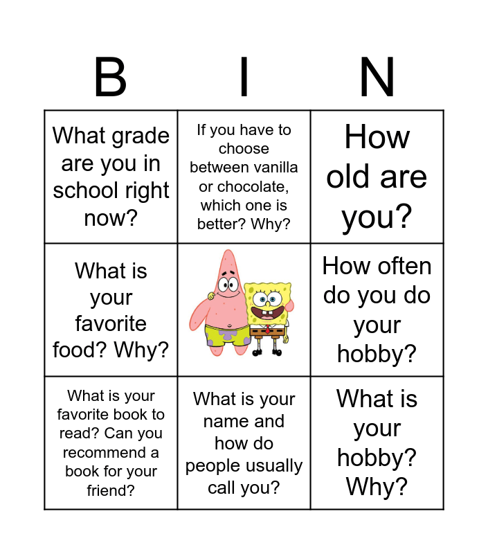 This bingo card has a free space and 10 words: What is your name and how do people usually call you?, How old are you?, What grade are you in school right now?, What is your hobby? Why?, What is your favorite food? Why?, What is your favorite book to read? Can you recommend a book for your friend?, If you have to choose between vanilla or chocolate, which one is better? Why?, What is your favorite lesson at school? Why?, How often do you do your hobby? and Can you tell how do you make your favorite food?.