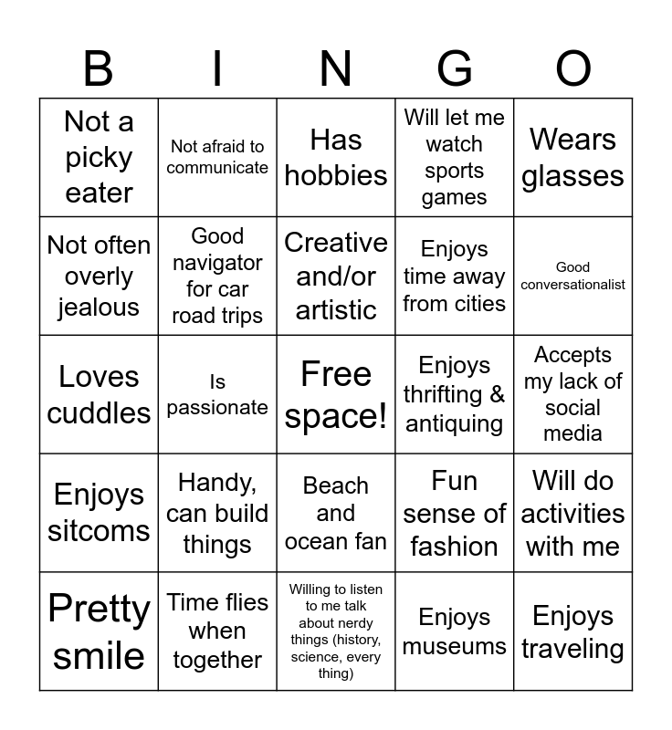 This bingo card has a free space and 24 words: Handy, can build things, Time flies when together, Creative and/or artistic, Pretty smile, Wears glasses, Not a picky eater, Not often overly jealous, Not afraid to communicate, Enjoys thrifting & antiquing, Beach and ocean fan, Enjoys time away from cities, Loves cuddles, Fun sense of fashion, Will do activities with me, Good navigator for car road trips, Enjoys museums, Accepts my lack of social media, Has hobbies, Good conversationalist, Is passionate, Enjoys traveling, Enjoys sitcoms, Will let me watch sports games and Willing to listen to me talk about nerdy things (history, science, every thing).