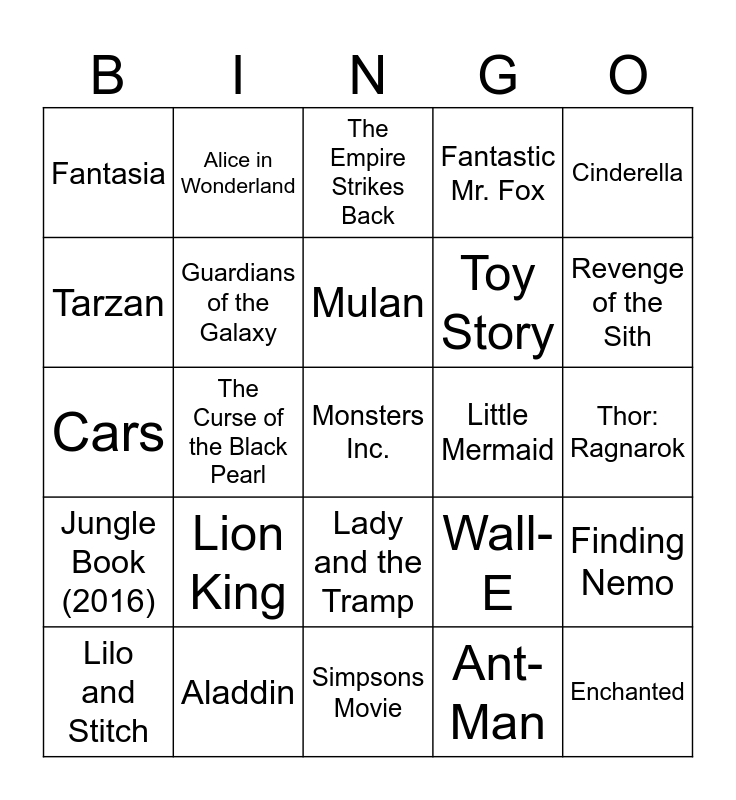 This bingo card has a free space and 24 words: Lion King, Aladdin, Mulan, Lilo and Stitch, Cinderella, Fantasia, Tarzan, Alice in Wonderland, Little Mermaid, Lady and the Tramp, Toy Story, Cars, Wall-E, Finding Nemo, Guardians of the Galaxy, Ant-Man, Thor: Ragnarok, The Empire Strikes Back, Revenge of the Sith, The Curse of the Black Pearl, Enchanted, Jungle Book (2016), Fantastic Mr. Fox and Simpsons Movie.