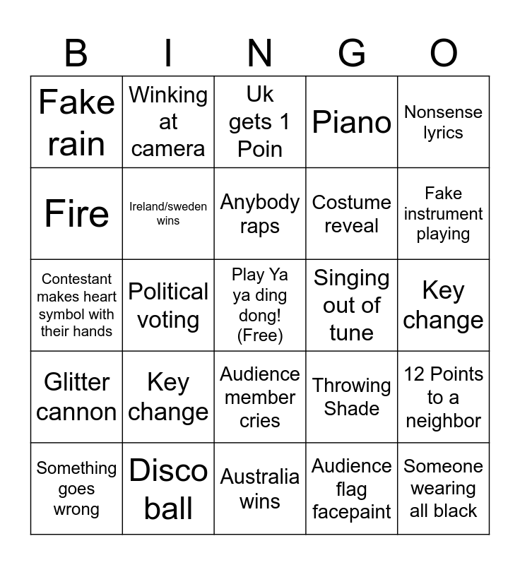 This bingo card has a free space and 24 words: Key change, Disco ball, Anybody raps, Something goes wrong, Nonsense lyrics, Fake rain, Fire, Winking at camera, Singing out of tune, Audience member cries, Costume reveal, Contestant makes heart symbol with their hands, Throwing Shade, 12 Points to a neighbor, Ireland/sweden wins, Audience flag facepaint, Key change, Uk gets 1 Poin, Fake instrument playing, Political voting, Someone wearing all black, Glitter cannon, Piano and Australia wins.