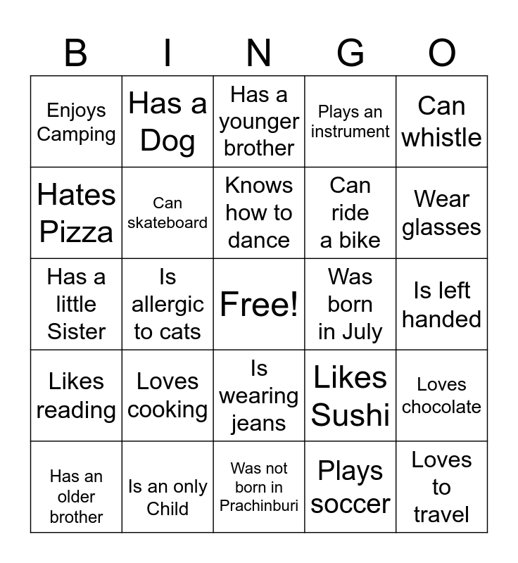 This bingo card has a free space and 24 words: Loves cooking, Is an only Child, Knows how to dance, Has an older brother, Can whistle, Enjoys Camping, Hates Pizza, Has a Dog, Was born in July, Is wearing jeans, Can ride a bike, Has a little Sister, Likes Sushi, Loves chocolate, Can skateboard, Plays soccer, Is left handed, Has a younger brother, Wear glasses, Is allergic to cats, Loves to travel, Likes reading, Plays an instrument and Was not born in Prachinburi.