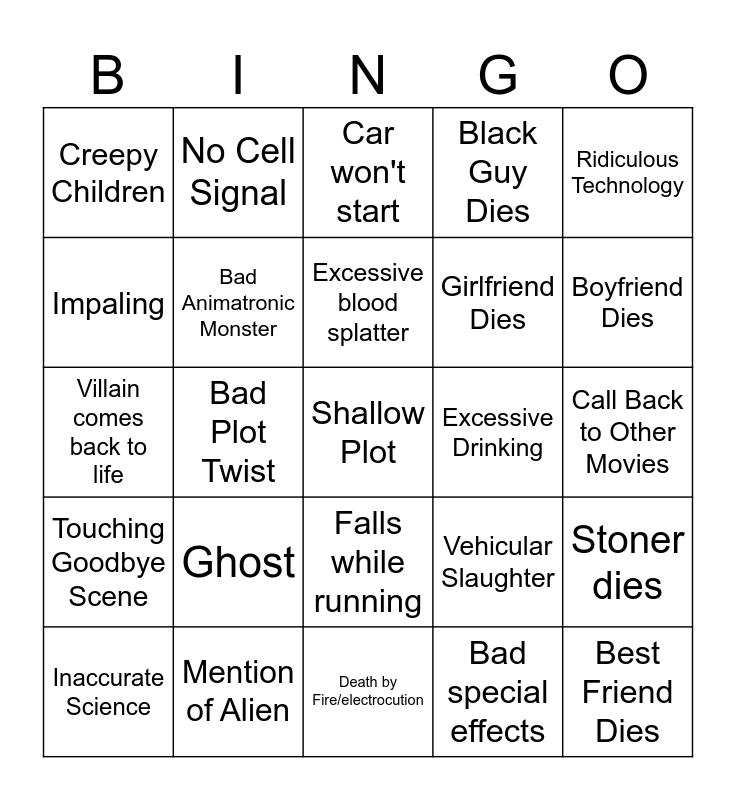 This bingo card has a free space and 39 words: Nudity, Party Scene, Cheesy One-liners, Bad Animatronic Monster, Inaccurate Science, Falls while running, Excessive blood splatter, Disem-boweling, Ridiculous Technology, Touching Goodbye Scene, Bad Plot Twist, Black Guy Dies, Best Friend Dies, Call Back to Other Movies, Excessive Drinking, Ghost, Alternate Dimension, Creepy Children, Creepy Toy, Vehicular Slaughter, Impaling, Death by Fire/electrocution, Girlfriend Dies, Boyfriend Dies, Nerd Hero, Pentagram, Chainsaw, Jump Scare, Mirror Scare, No Cell Signal, Trapped, Possessed Objects, Car won't start, Mention of Alien, Bad special effects, Airhead dies, Stoner dies, Villain comes back to life and Saving the Maiden.