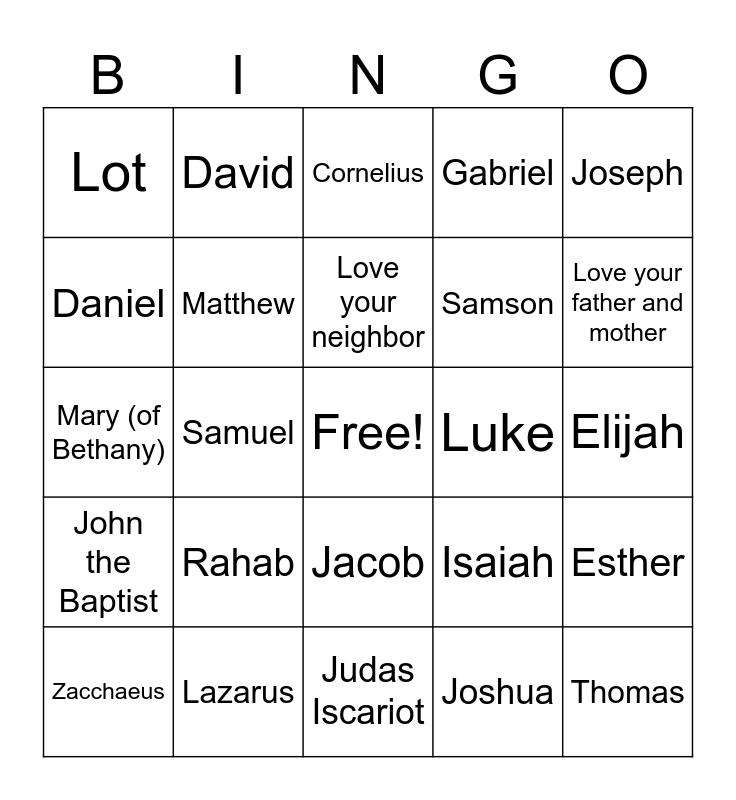 This bingo card has a free space and 42 words: Love God with your heart, soul, and mind, Love your neighbor, Noah, Rahab, Joshua, Esther, Thomas, Hannah, Cornelius, Jacob, Elijah, Love your father and mother, Samuel, Joseph, Peter, Isaiah, Martha, Mary (of Bethany), Jesus, David, Daniel, Ruth, Paul, Lot, Rachel, Moses, Samson, Job, Aaron, Saul, Jonah, John the Baptist, Matthew, Judas Iscariot, Solomon, Zacchaeus, Lazarus, Luke, Isaac, Miriam, Gabriel and Pharaoh.