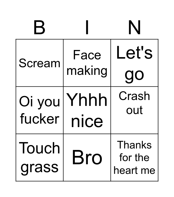 This bingo card has a free space and 8 words: Crash out, Let's go, Face making, Touch grass, Scream, Thanks for the heart me, Oi you fucker and Bro.